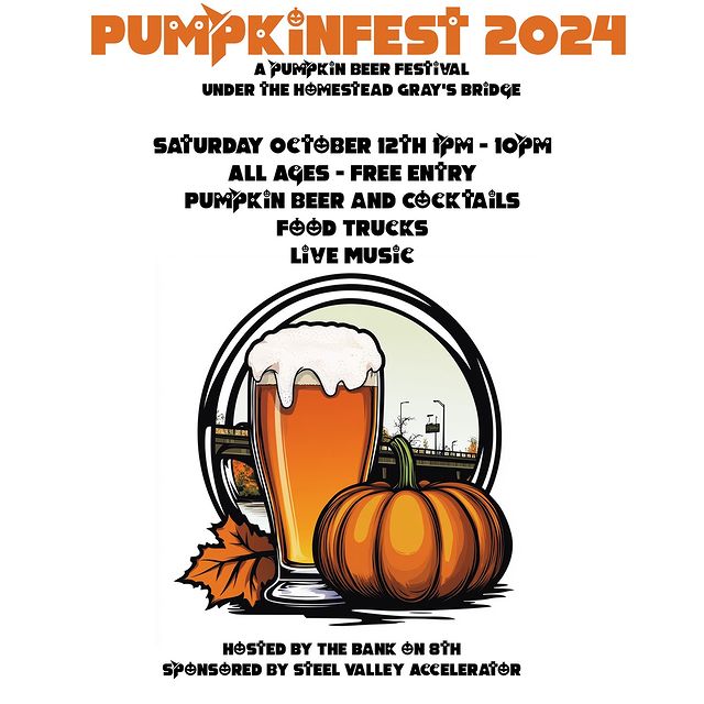 All Ages Welcome! No Cost for Entry! Join Us for a Fun-Filled Day Under the Homestead Grays Bridge! Date: Saturday, October 12th Time: 1:00 PM - 10:00 PM Location: Under the Homestead Grays Bridge Adult Beverages & Soft Drinks Available for purchase at our cash/card bar. Food Trucks On Site Enjoy a variety of delicious options! Pumpkin Photo Booth Area Capture your memories with a festive backdrop! Pumpkin Beer Flights Pre-Purchase Tickets: $15 Day of Event: $20 Live Music Schedule: * Pit Crew: 1:00 PM - 1:45 PM * Paplu: 2:00 PM - 3:00 PM * Dead End Street: 3:30 PM - 4:30 PM * Four Cut: 5:00 PM - 6:00 PM * TBD: 6:30 PM - 7:30 PM * My So Called 90s: 8:00 PM - 10:00 PM Come join us for a day of fun, food, and fantastic music! Venue Address: 101 W 7th Ave, Homestead, PA 15120